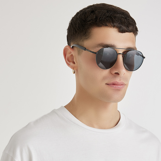 Unisex-Sonnenbrille mit lässigem und zeitlosem Design, die zu jedem Look passt. Sie zeichnet sich durch einen schwarzen Metallrahmen und graue Gläser aus.