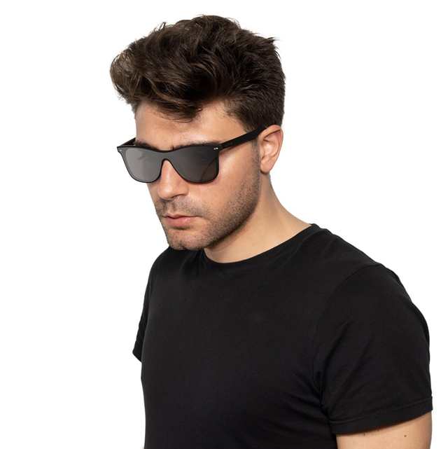 Unisex-Sonnenbrille mit klassischem, zeitlosem Design. Sie hat ein matt-schwarzes Gestell und silberfarben verspiegelte Gläser. Die Sonnenbrille wird in einer stilvollen Verpackung geliefert, die einen Stoffbeutel und ein Putztuch enthält, damit Sie Ihre Sonnenbrille überallhin mitnehmen können.