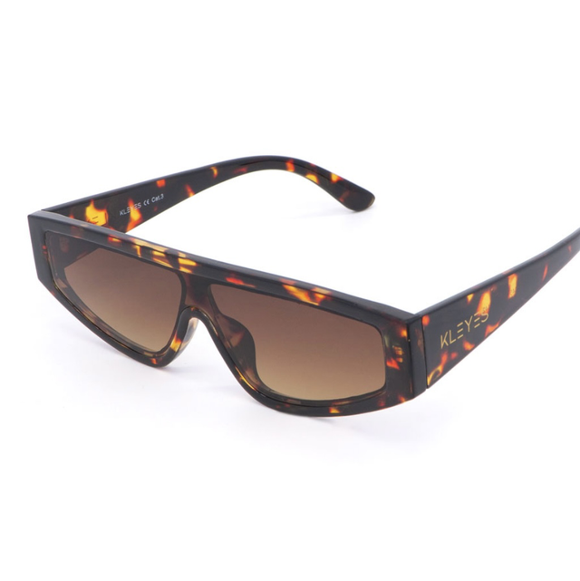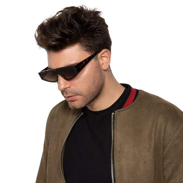Unisex-Sonnenbrille mit skurrilem und modernem Design; sie hat ein Gestell in Schildpatt-Optik und braune Gläser. Die Sonnenbrille wird in einer stilvollen Verpackung geliefert, die einen Stoffbeutel und ein Putztuch enthält, damit Sie Ihre Sonnenbrille überallhin mitnehmen können.